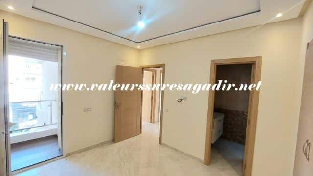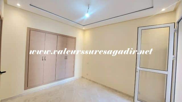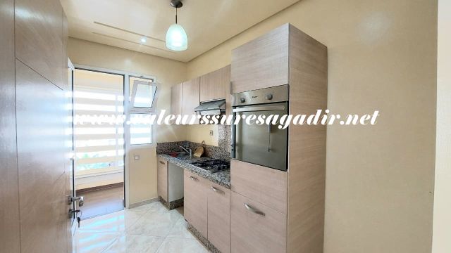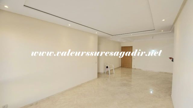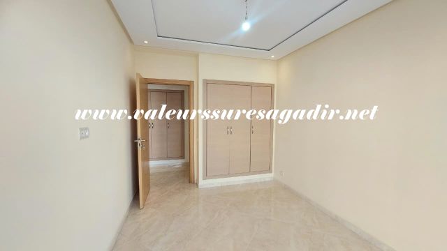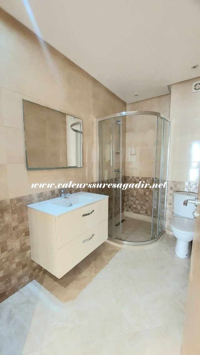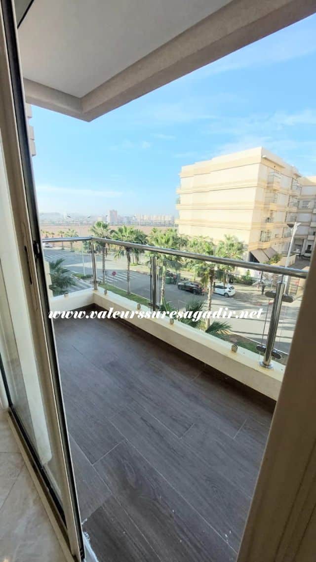 Ideally located apartment in Jardin d’Agadir, with a surface area of ​​96m². It comprises a living/dining room, a modern fitted kitchen with a door leading to a balcony, a bathroom with shower, sink, and toilet, three bedrooms with built-in wardrobes, a French window opening onto a balcony, and a parking space in the basement. Location: close to the city center and shops.