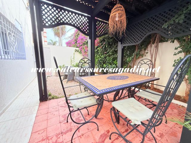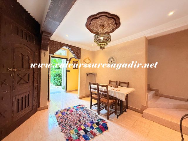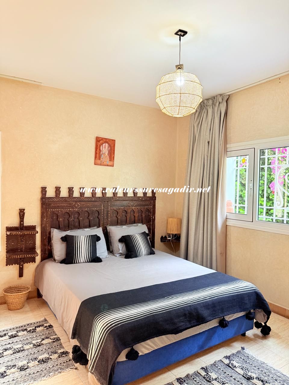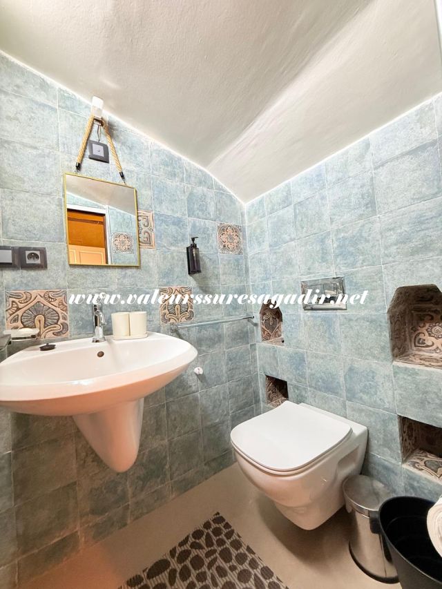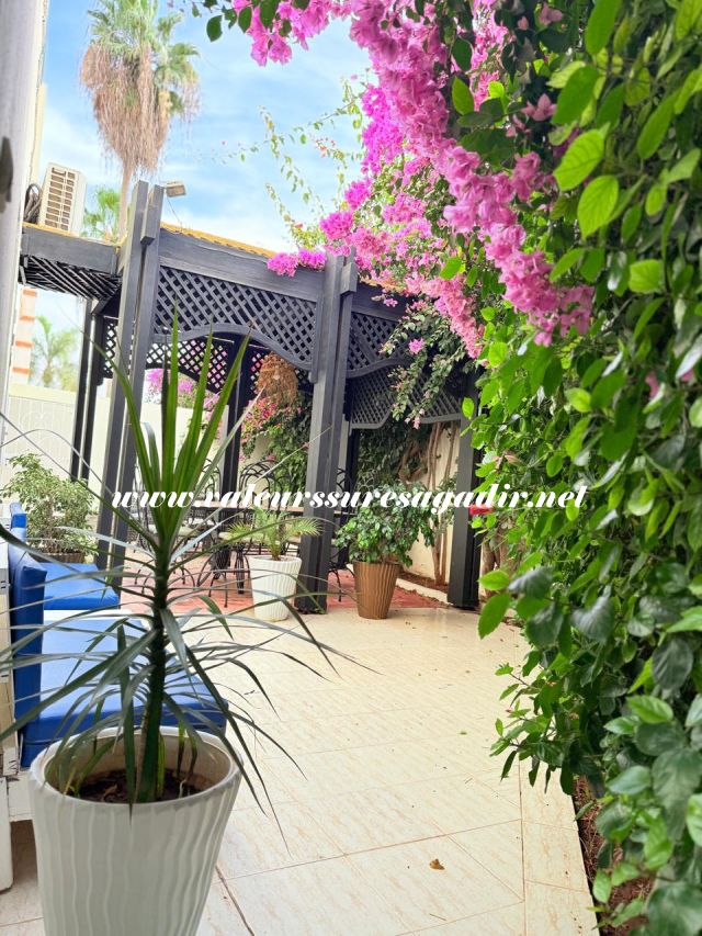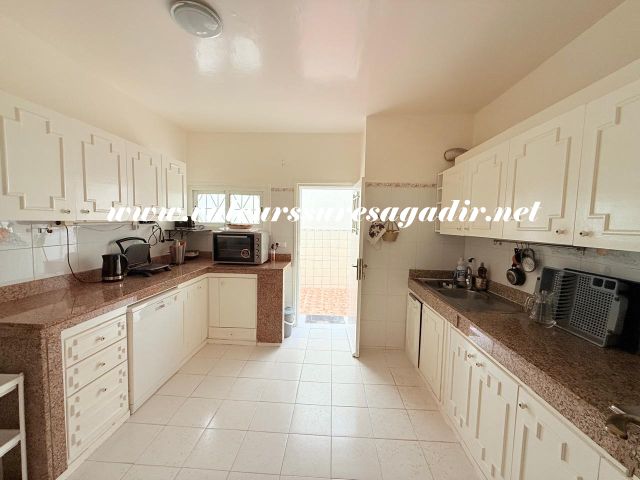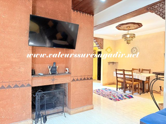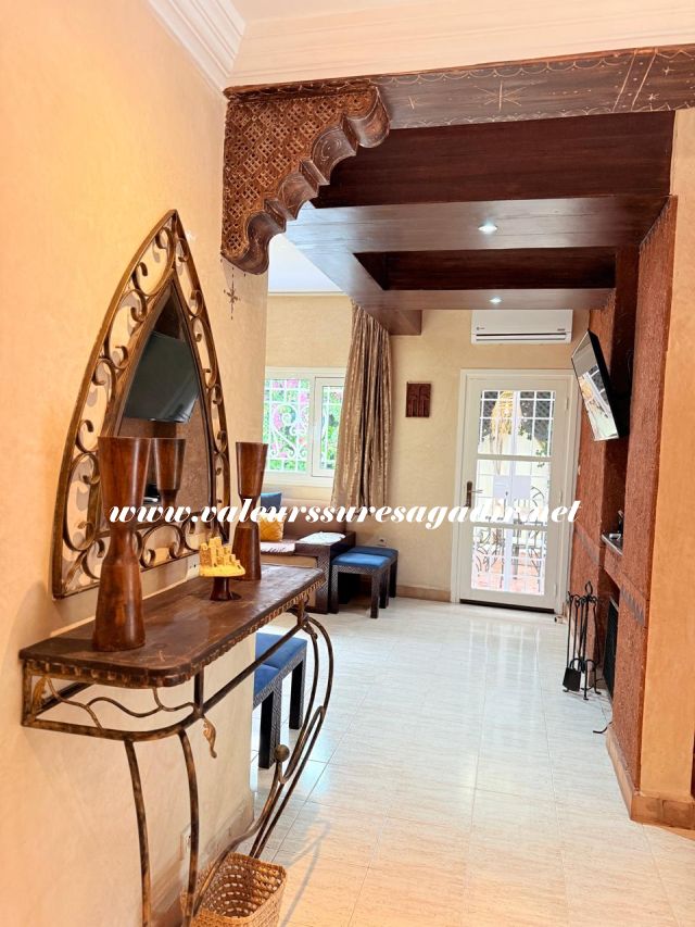 Treat yourself to an unforgettable holiday in this modern and comfortable villa, ideally located in the Taddart district of Agadir. It includes a spacious entrance hall, a bathroom with shower, sink, and toilet, a 24m² living room with a wood-burning fireplace, air conditioning, and a door leading to the terrace, a 6m² kitchen with a door leading to the terrace, a 12m² bedroom with a built-in wardrobe, and on the first floor: a landing, a 1m² balcony, a 16m² bedroom with a built-in wardrobe and air conditioning, a bathroom with shower, sink, and separate toilet, an 11m² bedroom with air conditioning, a 16m² bedroom with air conditioning, a built-in wardrobe, and a door leading to a 16m² terrace. There is also a 20m² front garden, a 60m² tiled side terrace, and a 30m² tiled rear terrace with an outdoor kitchen.