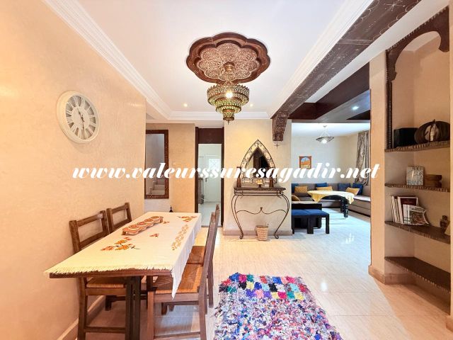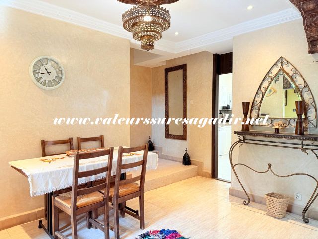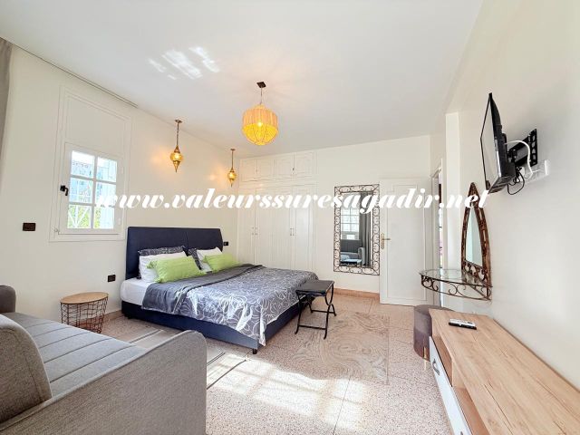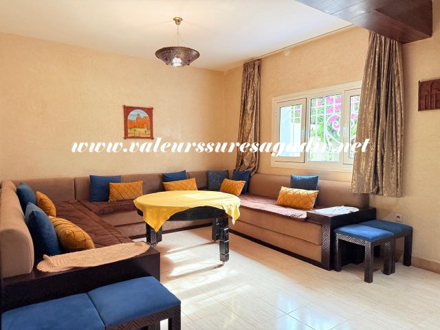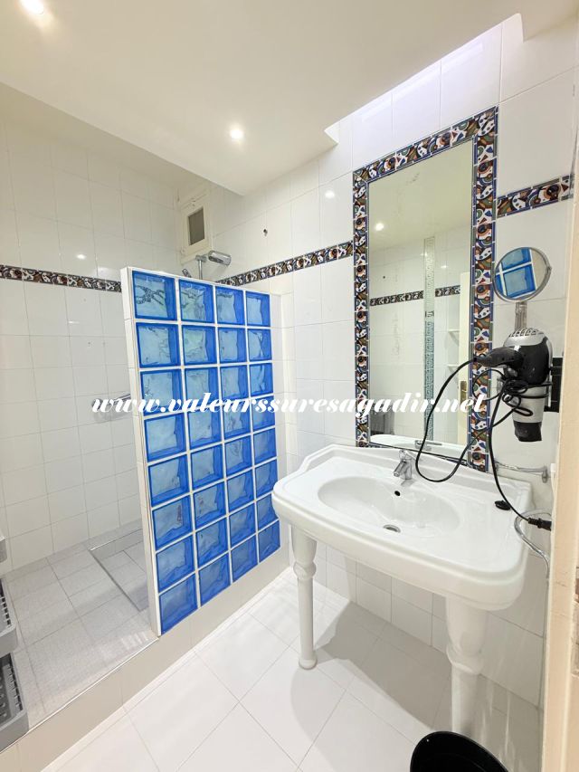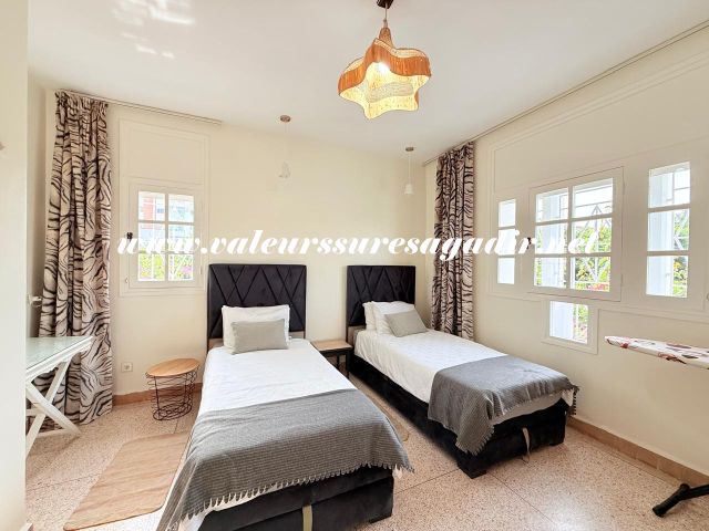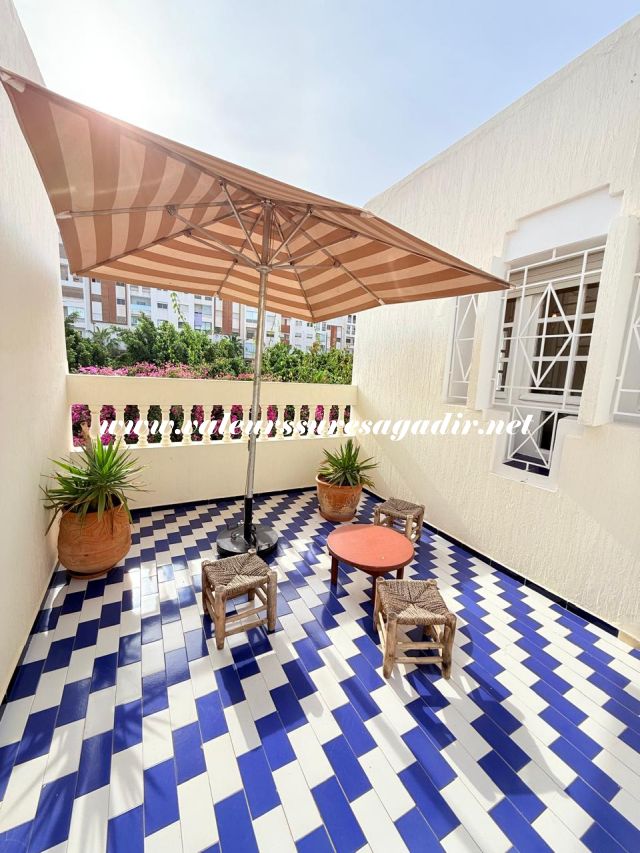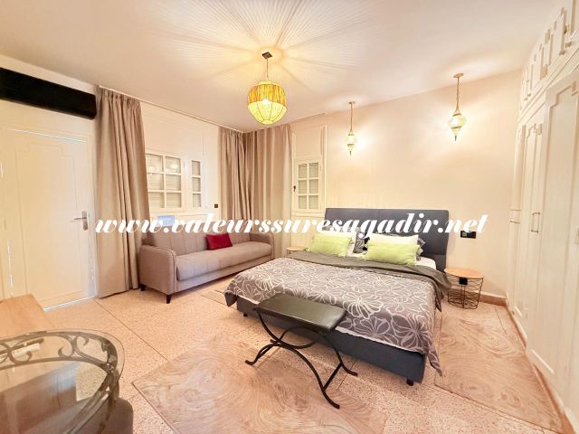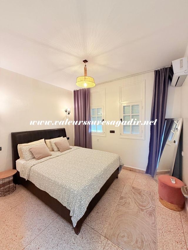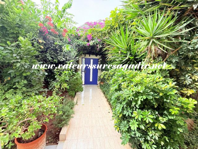 Treat yourself to an unforgettable holiday in this modern and comfortable villa, ideally located in the Taddart district of Agadir. It includes a spacious entrance hall, a bathroom with shower, sink, and toilet, a 24m² living room with a wood-burning fireplace, air conditioning, and a door leading to the terrace, a 6m² kitchen with a door leading to the terrace, a 12m² bedroom with a built-in wardrobe, and on the first floor: a landing, a 1m² balcony, a 16m² bedroom with a built-in wardrobe and air conditioning, a bathroom with shower, sink, and separate toilet, an 11m² bedroom with air conditioning, a 16m² bedroom with air conditioning, a built-in wardrobe, and a door leading to a 16m² terrace. There is also a 20m² front garden, a 60m² tiled side terrace, and a 30m² tiled rear terrace with an outdoor kitchen.