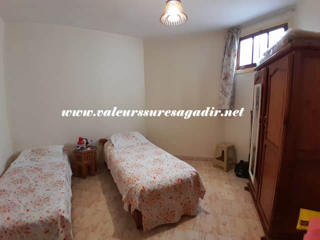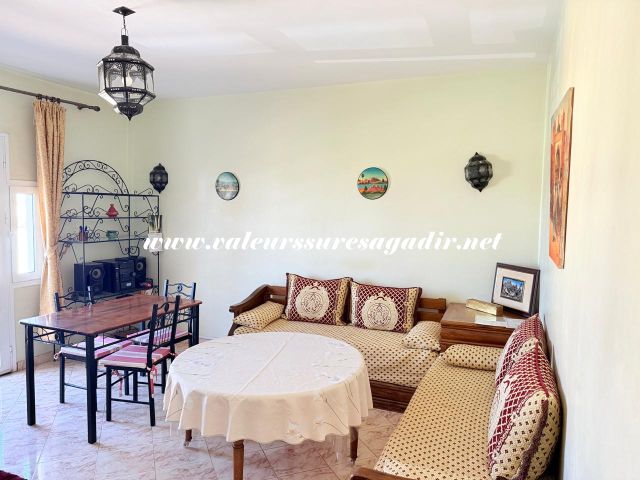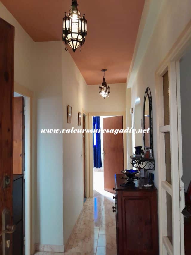 Passez un agréable séjour dans ce confortable appartement à 10 minutes de la plage. Il se compose d’un couloir avec hall, clim, cuisine, salon marocain avec porte sur balcon, 2 chambres dont une avec placard et salle de bain: baignoire, lavabo, wc.