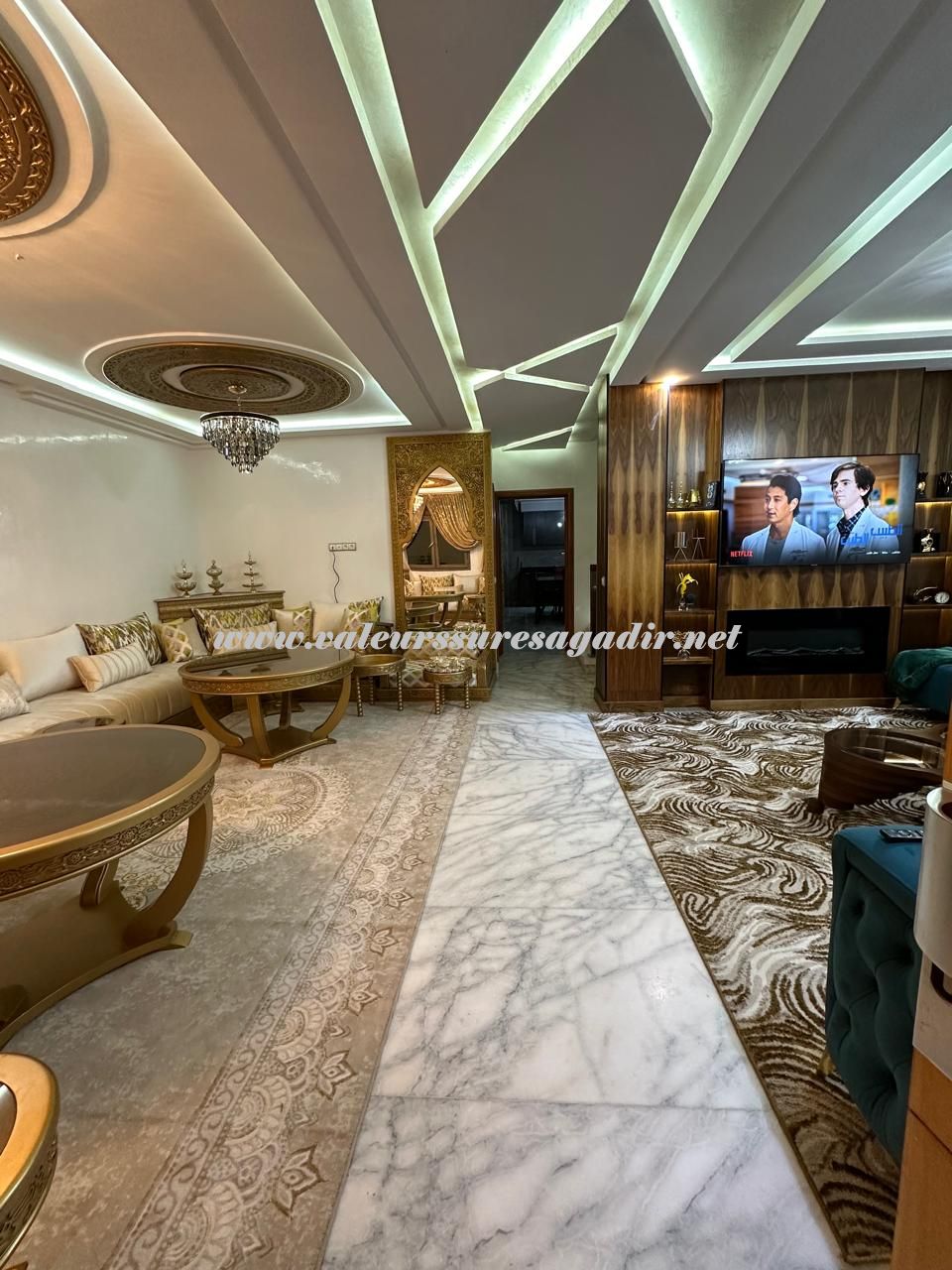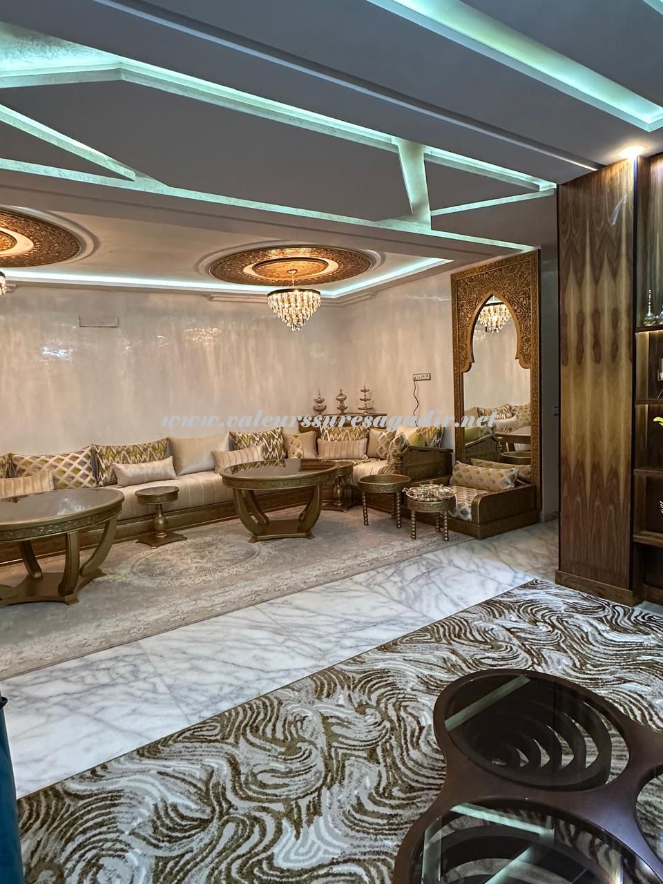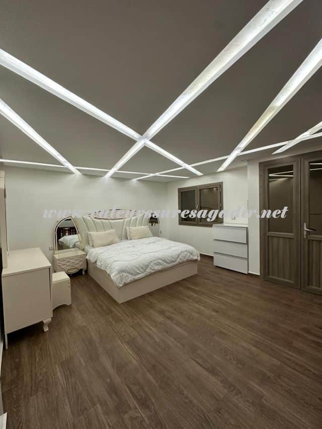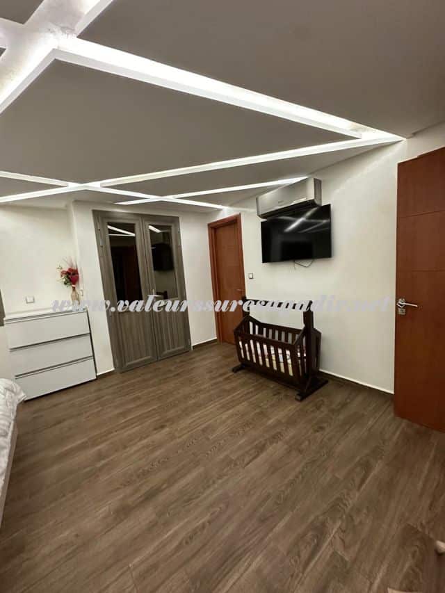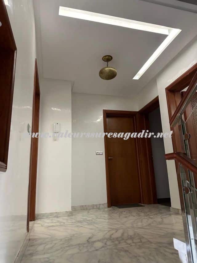Spacieuse villa située dans le quartier Tilila. Aménagée sur 2 niveaux, elle vous propose : Sas d’entrée, Salon droite moderne 20m², salon marocain gauche 20m², sellier sous escalier, double lavabos, sanitaire : lavabo, WC, cuisine équipée moderne avec électroménager baie vitrée sur terrasse 3 m², salon moderne clim 10m²,