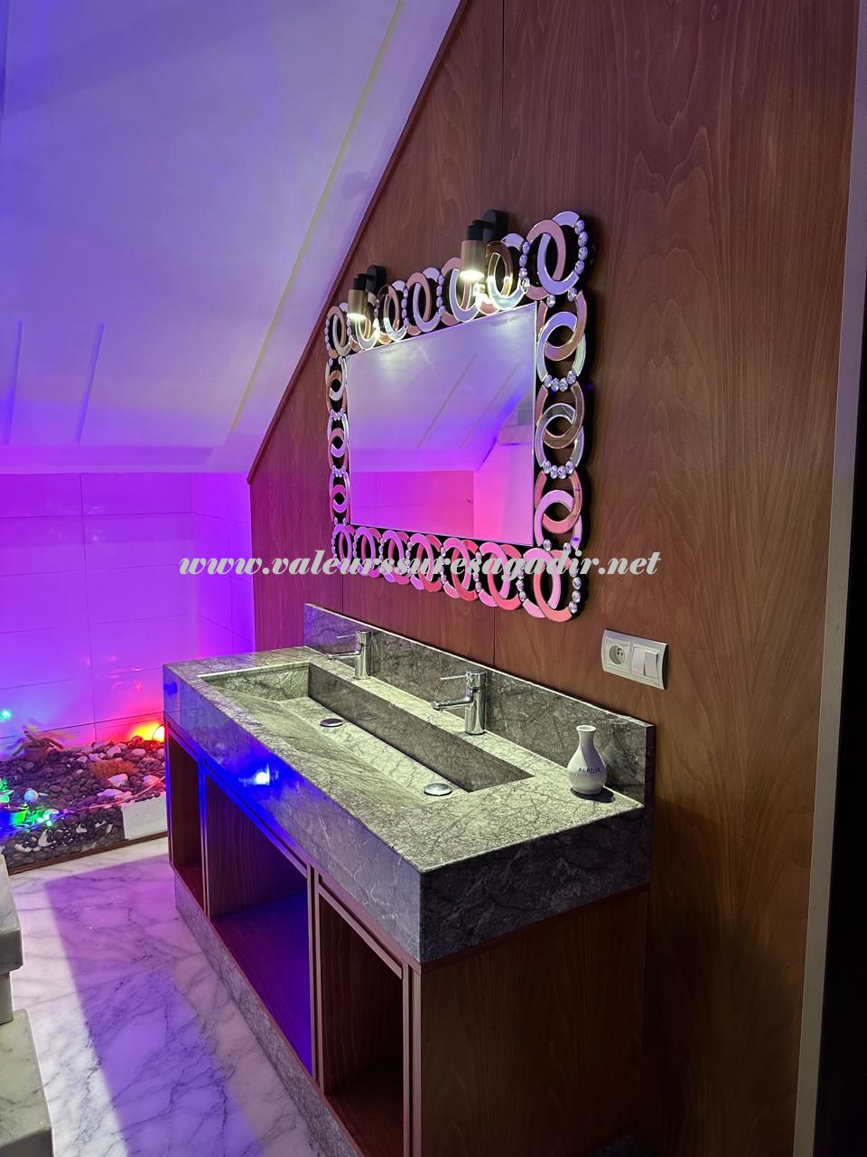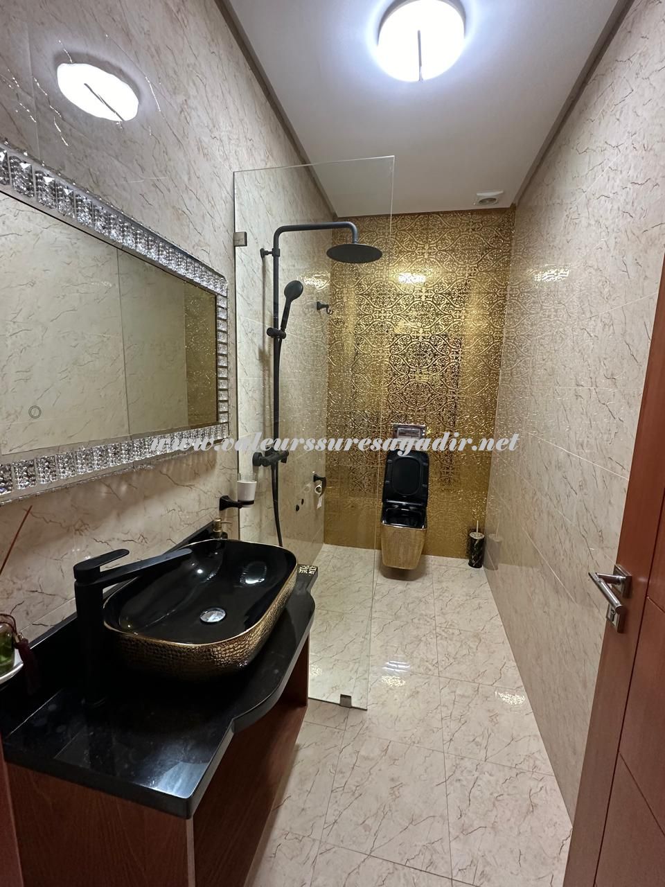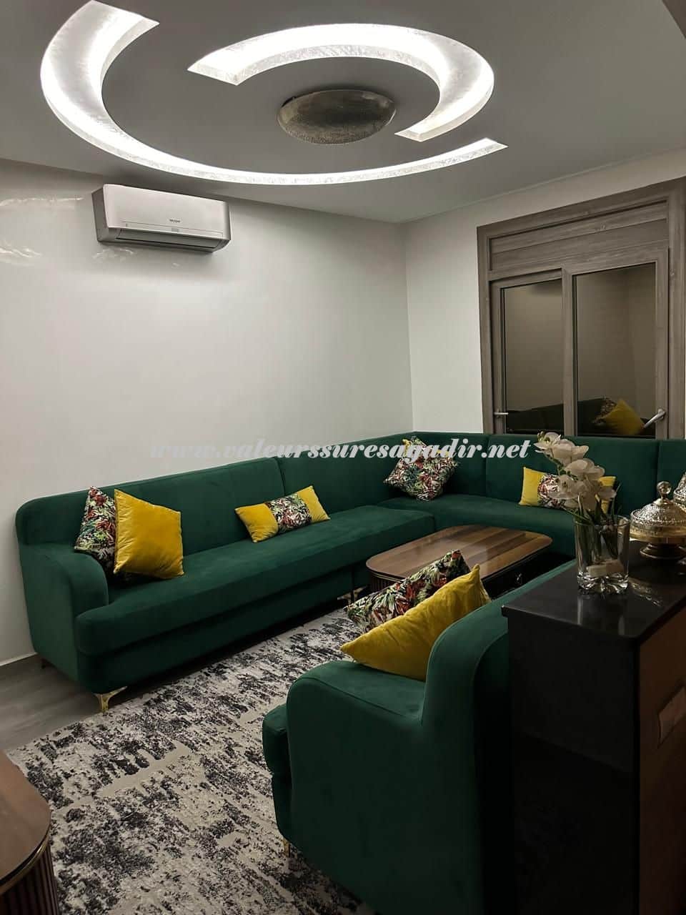 Spacieuse villa située dans le quartier Tilila. Aménagée sur 2 niveaux, elle vous propose : Sas d’entrée, Salon droite moderne 20m², salon marocain gauche 20m², sellier sous escalier, double lavabos, sanitaire : lavabo, WC, cuisine équipée moderne avec électroménager baie vitrée sur terrasse 3 m², salon moderne clim 10m²,